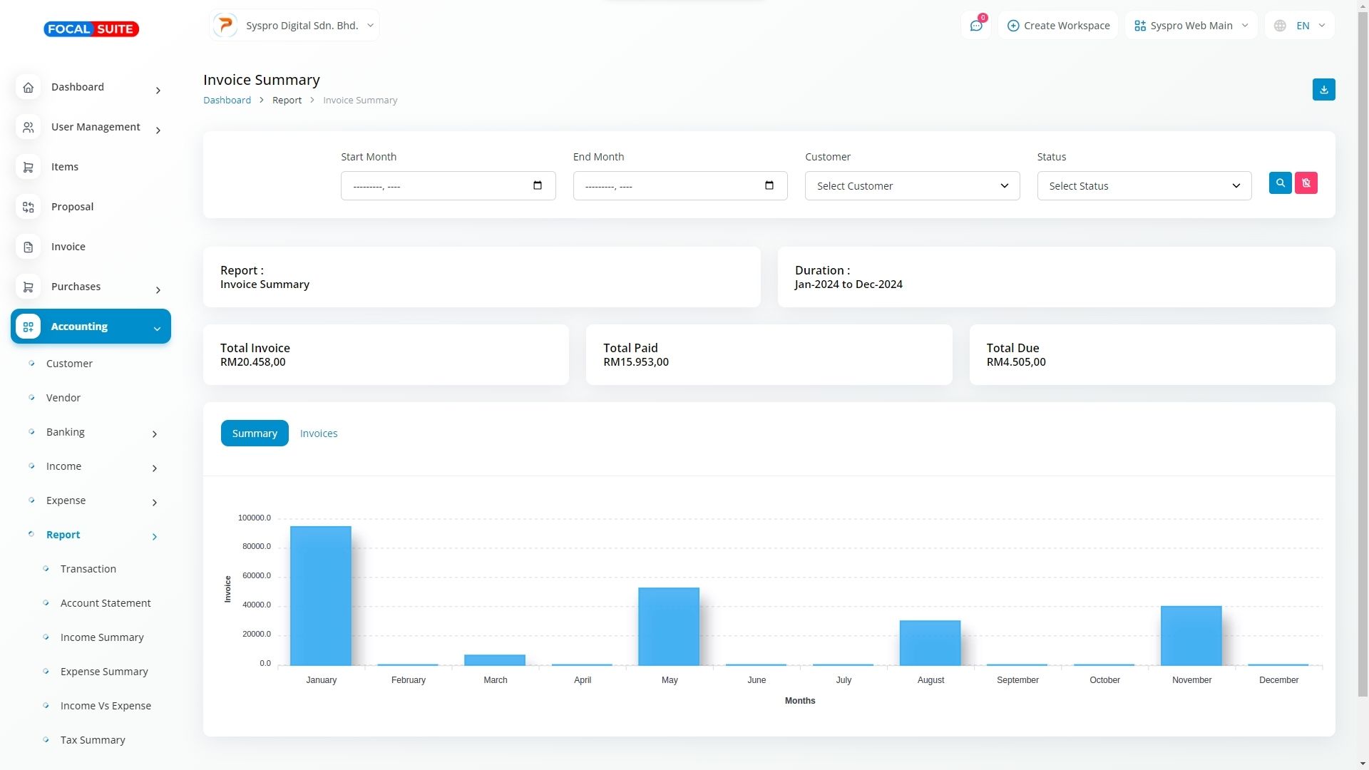 Receive comprehensive transaction reports with user-friendly filtering options. Download account statements in PDF, CSV, or Excel formats, and access detailed reports on Income, Expenses, Taxes, Invoices, and Bill Summaries. Customize your view by filtering data based on accounts, categories, and customers. Additionally, benefit from a graphical Income vs. Expense chart and a detailed Profit and Loss calculation to aid in decision-making. You can also filter tax summaries and Income vs. Expense charts by financial year.