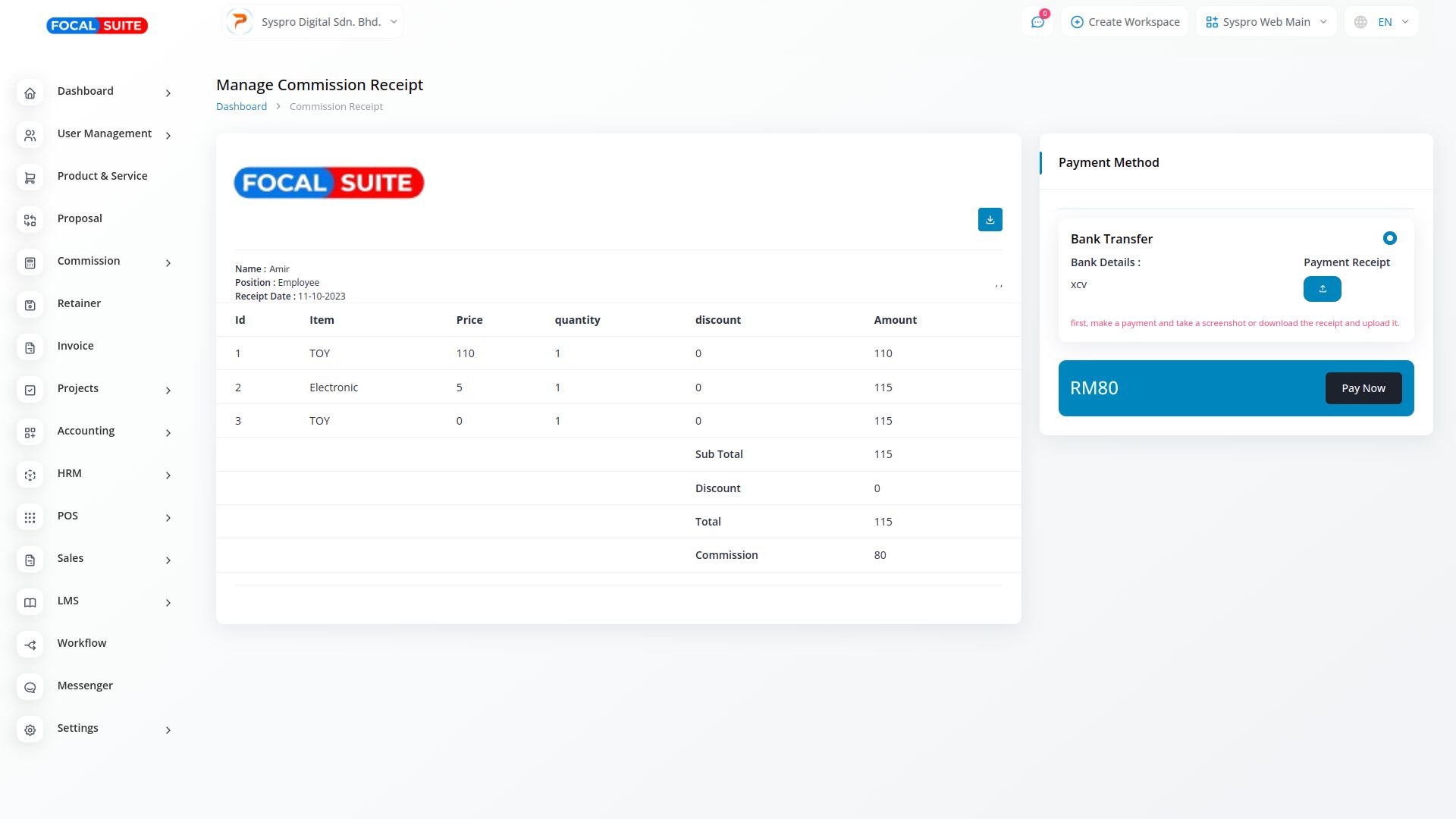 In the Commission Module, commission calculation is linked to invoices, sales invoices, projects, and tasks. An agent earns their commission once the payment is made, typically through a bank transfer. When the payment is processed, the bank transfer entry is recorded in the commission module, ensuring that the system tracks how much commission has been paid to the agent. This allows for accurate and transparent commission management based on actual payments received.