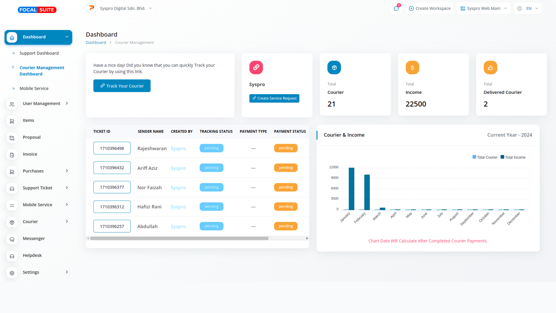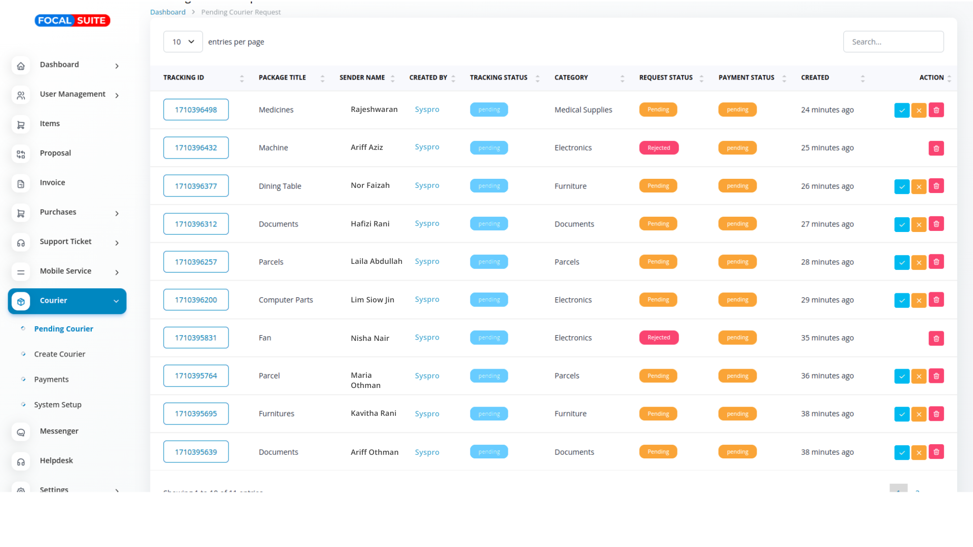 The Courier Management module in Focal Suite is a dedicated tool designed to streamline and optimize all courier-related processes. At its core is efficient order processing, enabling users to input and manage orders with complete details—including sender information, recipient details, and parcel specifications. This ensures a smooth, accurate, and reliable order flow, forming a solid foundation for effective courier operations.