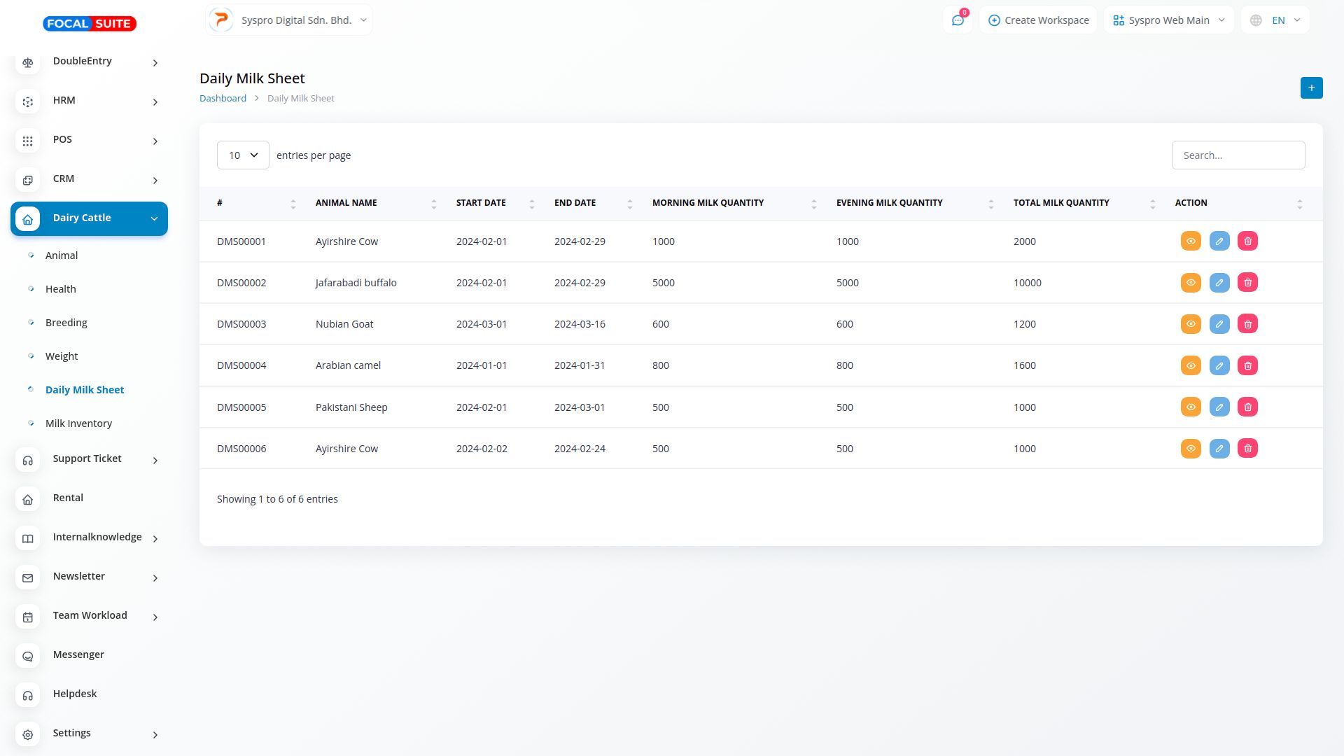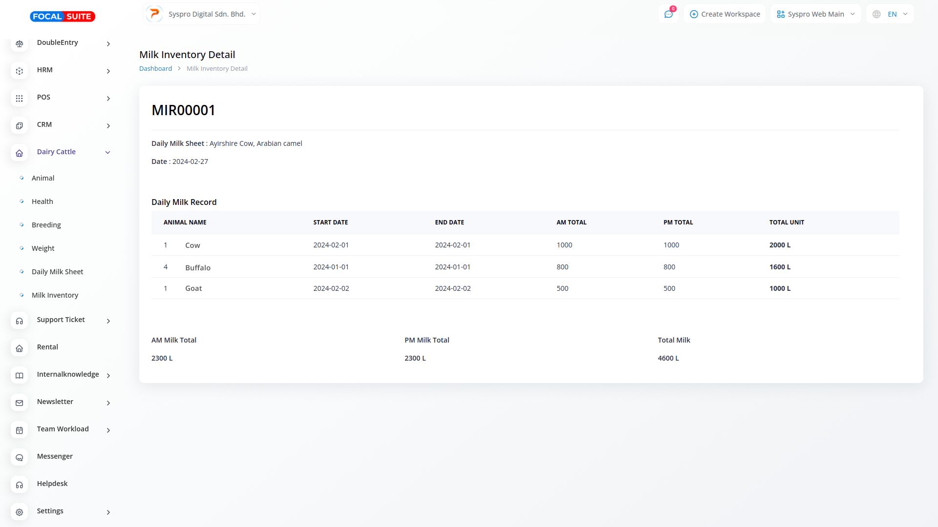 The Dairy and Cattle Management module in Focal Suite is your all-in-one solution for managing dairy cattle operations. Designed to streamline the complexities of dairy farm management, Focal Suite offers seamless integration for key tasks such as animal health monitoring, breeding management, weight tracking, daily milk yield recording, and milk inventory management. With Focal Suite, you can efficiently manage every aspect of your operations, ensuring the health of your herd while optimizing productivity.