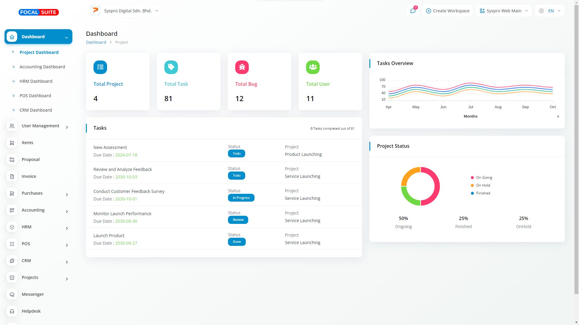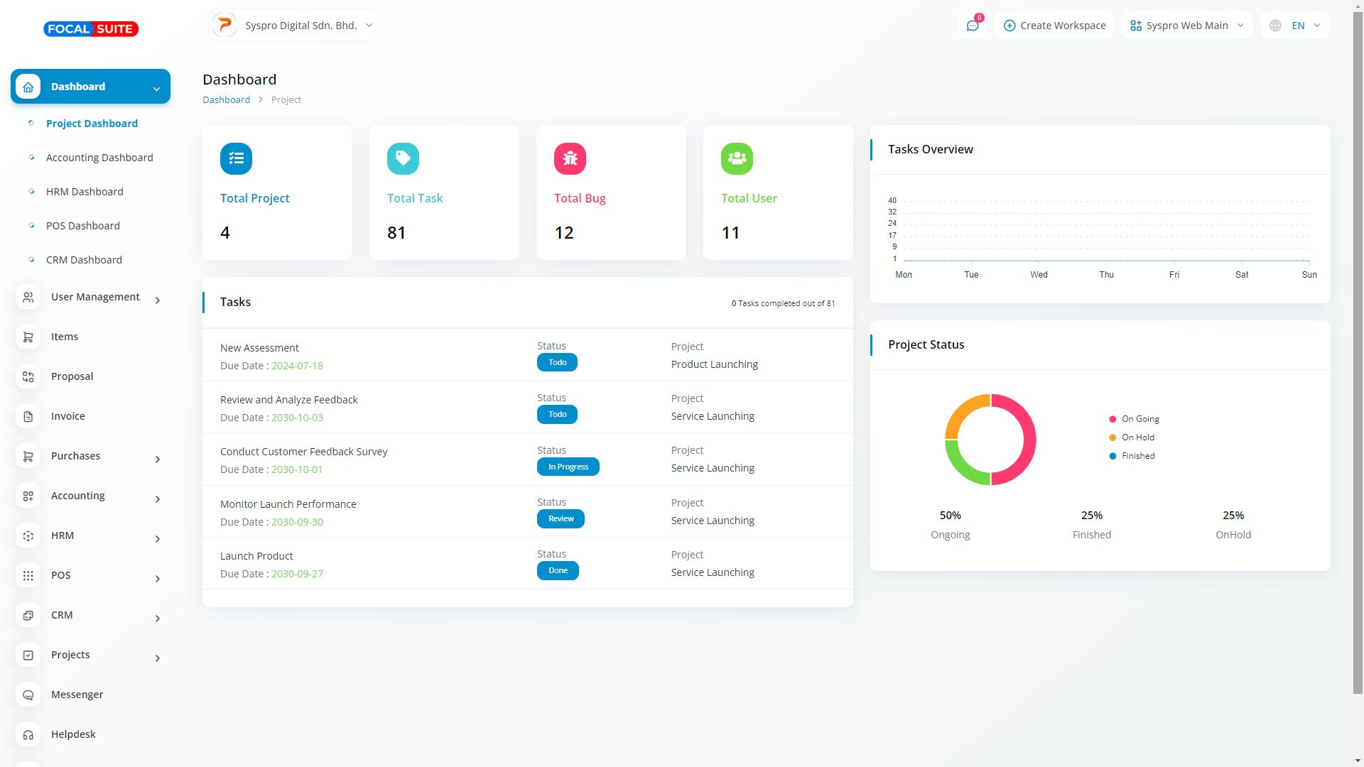 Get an overview of the total number of projects, tasks, bugs, and members. A visual representation of the task overview and project status can help you estimate the progress on each task. Lastly, you can check the top due task.